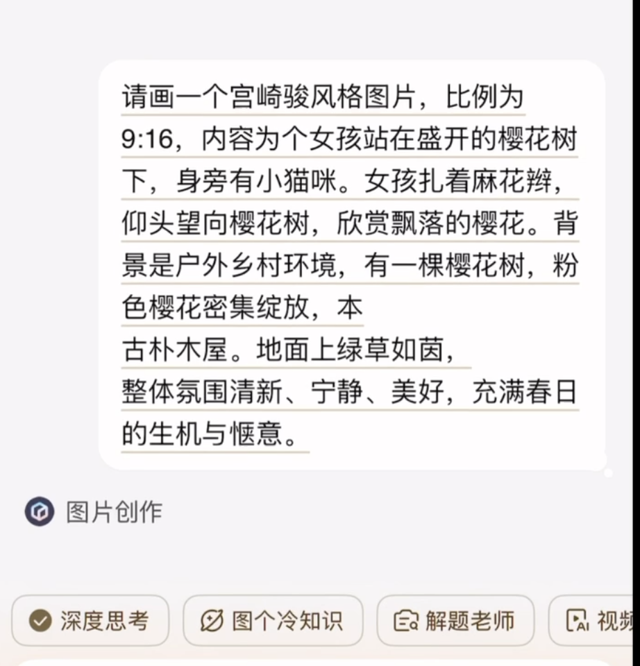 升级全新语音大模型、图片问答、AI生图生视频等多项能力,3、让文小言生成吉卜力风格图片和视频 在文小言app中选择图片创作,文小言实现了多模型间的智能协同。