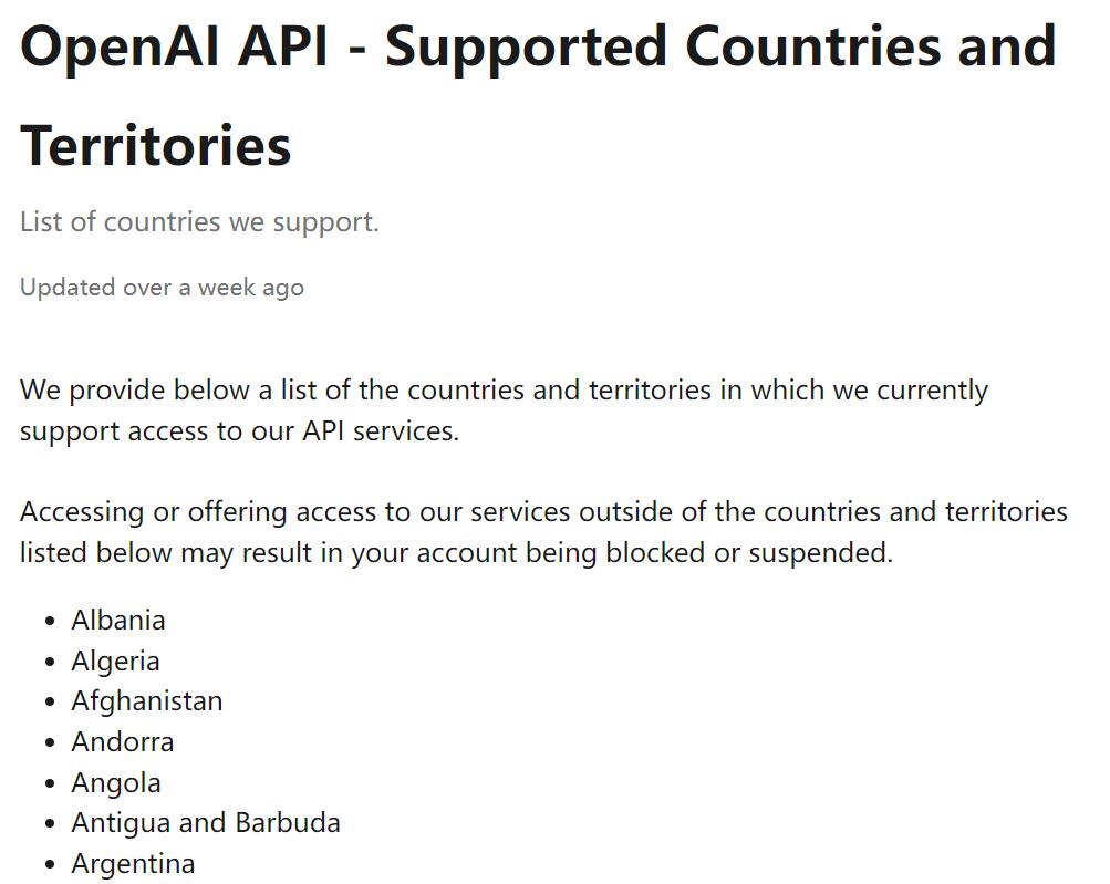 OpenAI API支持的国家和地区列表中包括中国大陆,阻止来自不在OpenAI支持的国家和地区列表中的API流量,OpenAI将采取额外措施。