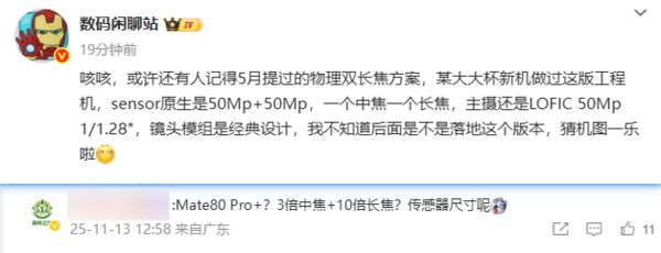 华为Mate80 Pro+或搭载双长焦:主摄采用1/1.28英寸LOFIC超大底传感器快讯