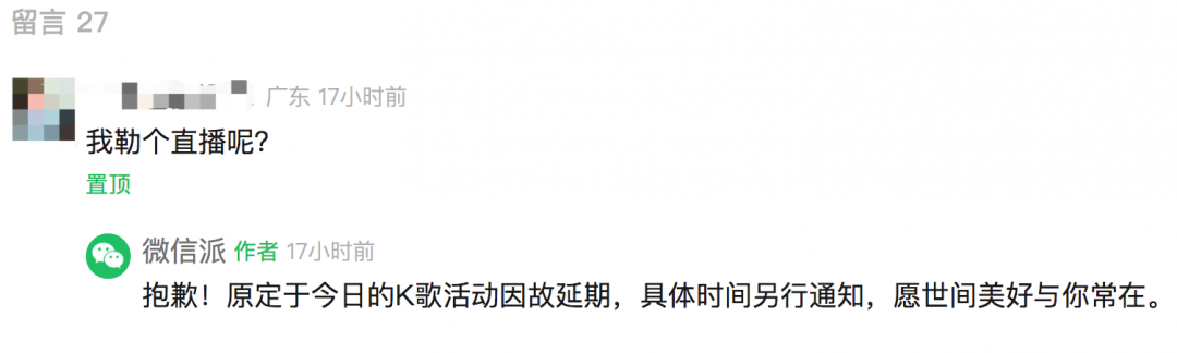不过当日晚间,微信派视频号没有如期开播。对此,微信派在评论区回应称,“原定于今日的K歌活动因故延期,具体时间另行通知”。