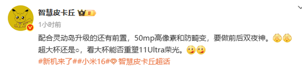 据知名数码博主@智慧皮卡丘 最新发布的信息显示,与此前曝光的消息基本一致,全新的小米16 Ultra将采用前置灵动岛设计,同时前置影像系统将升级,配备5000万像素的高素质镜头,支持防畸变技术,并且还要做前后双夜神。结合此前相关爆料,该机的后置相机模组预计配备徕卡四摄,采用2亿像素大底+多群潜望方案,双光变焦段共享CMOS,连续变焦更顺滑。值得注意的是,小米和徕卡的合作将会更加深入,双方将会通过镜头光学、芯片、算法等领域的技术突破提升移动影像时代的光学表现和摄影体验。