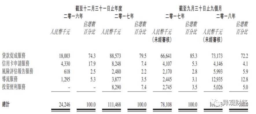 其中,贷款促成服务最主要的收入来源。截至2018年9月30日,公司贷款促成服务收入7317.3万元人民币(单位下同),占公司总收入的72.2%。截至2018年9月30日,促成贷款规模累计达90亿,有关服务累计借款人20.9万人。