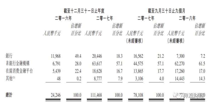 根据招股书显示,截至2018年9月30日止9个月,银行收入占比为7.2%,较上一年同期的21.2%下降14%,而非银行金融机构收入占比为61.5%,较上年同期的57.1%上涨4.4%。