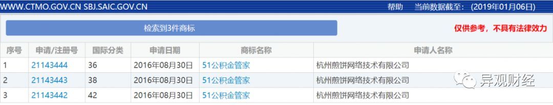 异观财经在国家知识产权局商标局 中国商标网查询,“51公积金管家”的商标名称,检索到3次申请记录,国际分类包含36、38、42.目前国际分类38、42处于“等待实质审查”状态;国际分类36处于“申请被驳回、不予受理等,该商标已失效”。