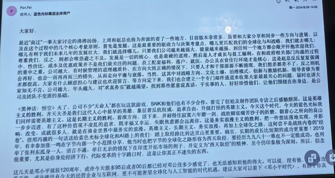 蓝色光标创始人赵文权和CEO潘飞曾发了数封动员信,为公司“南迁”做铺垫。在新浪科技获取到的一份邮件中,今年8月26日,潘飞曾发布邮件提及公司“南迁”事宜,称“南迁”地选择最重要的驱动力与决策考量点是“发展”“哪儿更匹配我们的全球化战略,我们就去哪儿;哪儿有利于我们未来几年的发展壮大,我们就选择哪儿”。