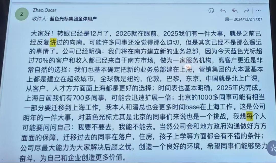 据内部人士透露,此前公司内部一直在传言蓝色光标南迁选择的城市可能会是“杭州”,因为蓝色光标创始人赵文权的老家距离杭州较近,或许能够获取更多政府支持。不过到今年12月2日,赵文权通过邮件宣布了公司南迁的决定——目的地选择在上海。这意味着北京1000多名员工中,有很多人将迁往上海,并计划在2025年内完成整个南迁过程。”