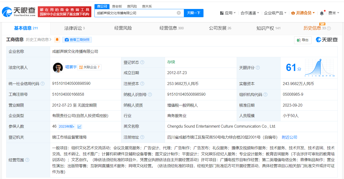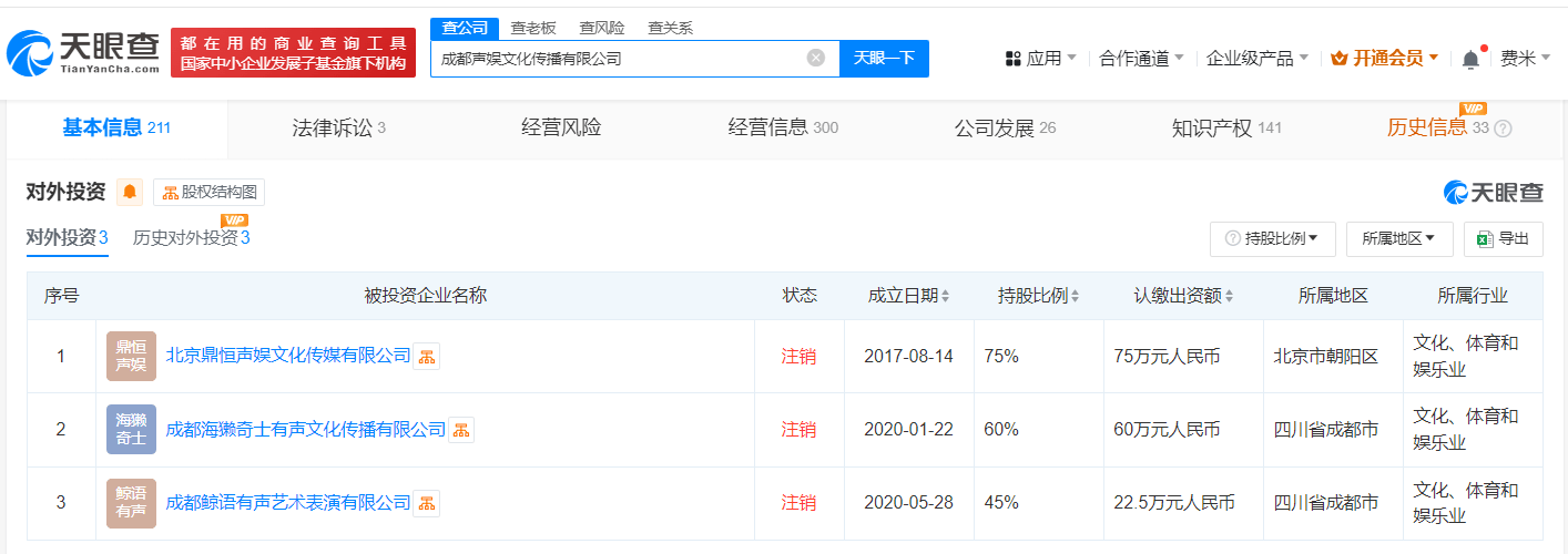 天眼查App显示,成都声娱文化传播有限公司成立于2012年7月,法定代表人为唱寰宇,注册资本约254万人民币,经营范围含组织文化艺术交流活动、会议及展览服务、礼仪服务等,由唱寰宇、广西青瑟创业投资有限公司、成都声鱼片文化传播合伙企业(有限合伙)等共同持股。对外投资信息显示,该公司投资的北京鼎恒声娱文化传媒有限公司、成都海獭奇士有声文化传播有限公司、成都鲸语有声艺术表演有限公司均已注销。法律诉讼信息显示,近期,该公司因劳动争议案件被孟某起诉,该案在成都高新技术产业开发区人民法院开庭审理。