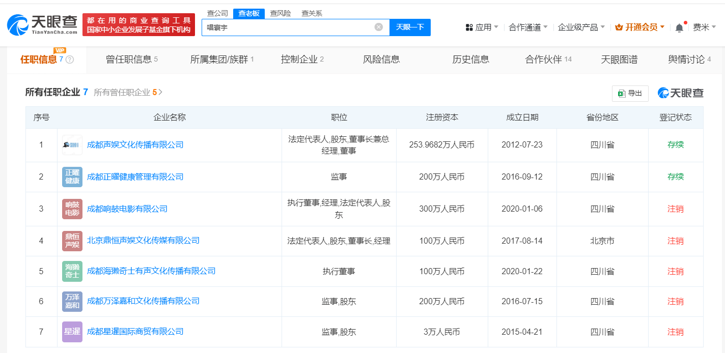 此外,唱寰宇名下关联7家企业,其中2家为存续状态,分别是成都声娱文化传播有限公司、成都正曜健康管理有限公司,其余5家公司均已注销。