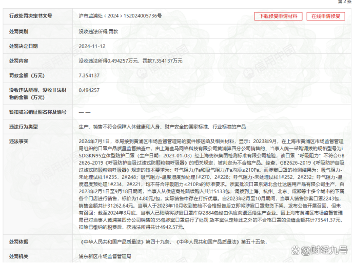 值得注意的是,就在去年11月份,上海盒马网络科技有限公司被查到销售的防护口罩不符合相关规定,被判定为不合格产品而被处以罚款处罚。该公司在去年还因为未取得销售国家二级野生保护植物的批准,在平台上销售野生松茸被处罚等等。