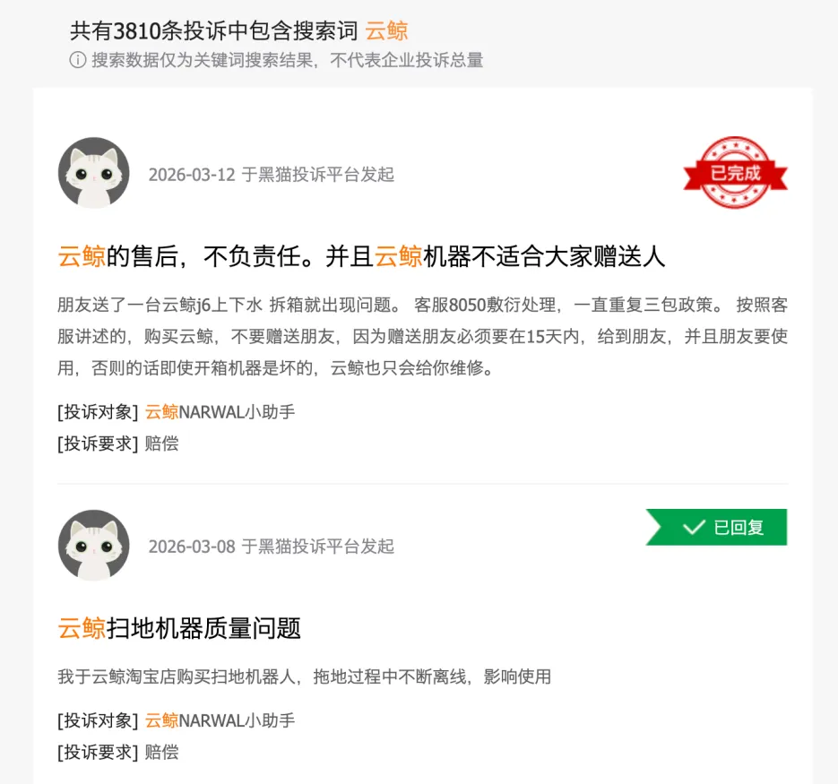 更尴尬的是,为了追赶进度而加速推出的新品,反而引发了品质反噬,用户口碑也持续承压。截至目前,黑猫投诉平台上关于云鲸的投诉量已突破3800条。其中,扫地机器人无法正常充电、机器频繁报错、拖布模块故障、售后响应慢等问题成为用户吐槽的焦点。
