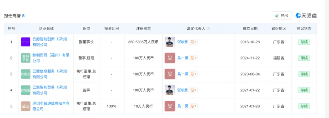 天眼查信息显示,截至2026年4月7日,吴一昊仍担任鲸制贸易(福州)有限公司、云鲸信息服务(深圳)有限公司的法定代表人,并在云鲸智能创新(深圳)有限公司、云鲸智能贸易(深圳)有限公司等多家公司担任副董事长等高管职务。