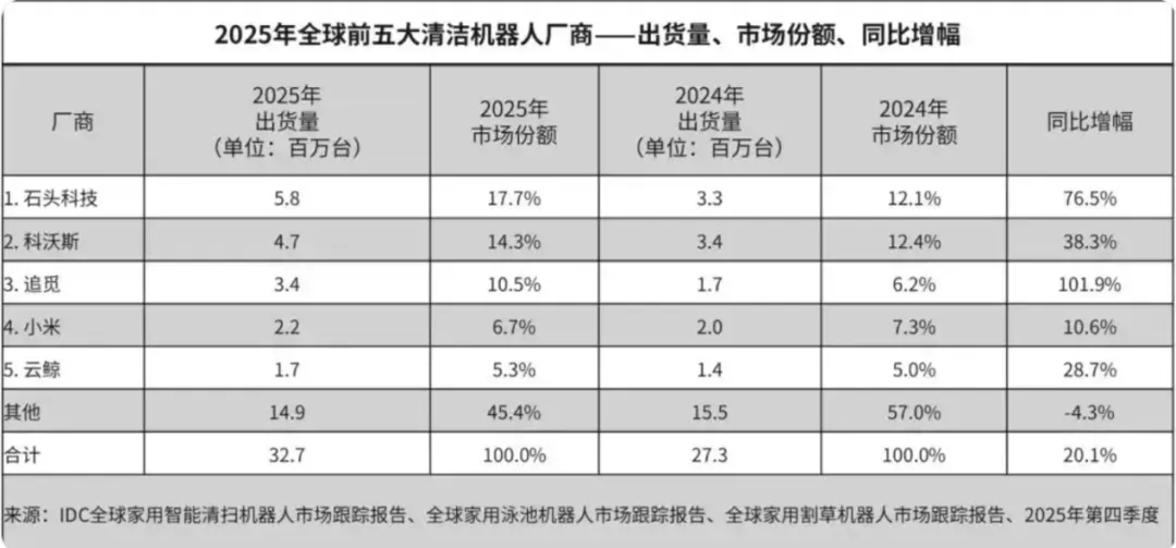 从市场格局来看,头部集中度进一步提升。IDC 数据显示,2025 年全球清洁机器人厂商排名中,石头科技以580万台出货量、17.7% 份额位居第一,科沃斯、追觅分别以 470 万台、340 万台位列二、三名。其中,云鲸仅排在第五位,市场地位并不稳固。