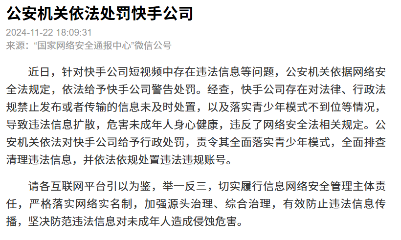因为就在今年11月22号,“国家网络安全通报中心”发布消息,快手因“落实青少年模式不到位,导致违法信息扩散,危害未成年人身心健康”等问题,被有关部门依据《网络安全法》相关规定给予行政处罚。
