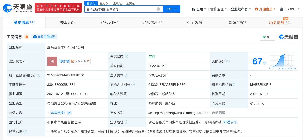 天眼查App显示,嘉兴远明羊服饰有限公司成立于2022年7月,法定代表人为刘明增,注册资本500万人民币,经营范围含服饰制造、服饰研发、服装辅料制造等,由刘明增、张芳芳共同持股。年报信息显示,该公司2023年参保人数为1人。风险信息显示,今年8月,该公司因拖欠增值税、城市维护建设税合计1.74万余元被公告。