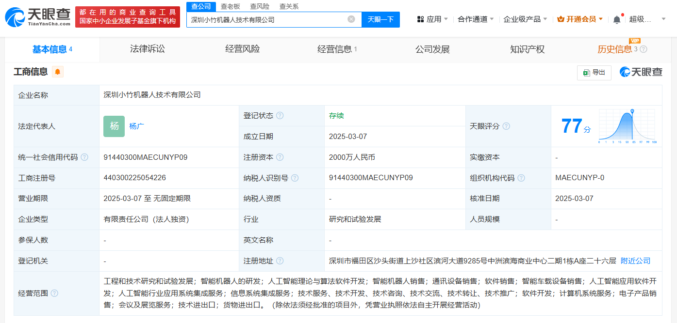 近日,深圳小竹机器人技术有限公司成立,法定代表人为杨广,注册资本2000万人民币,经营范围包括智能机器人的研发、人工智能理论与算法软件开发、智能机器人销售、人工智能应用软件开发等。