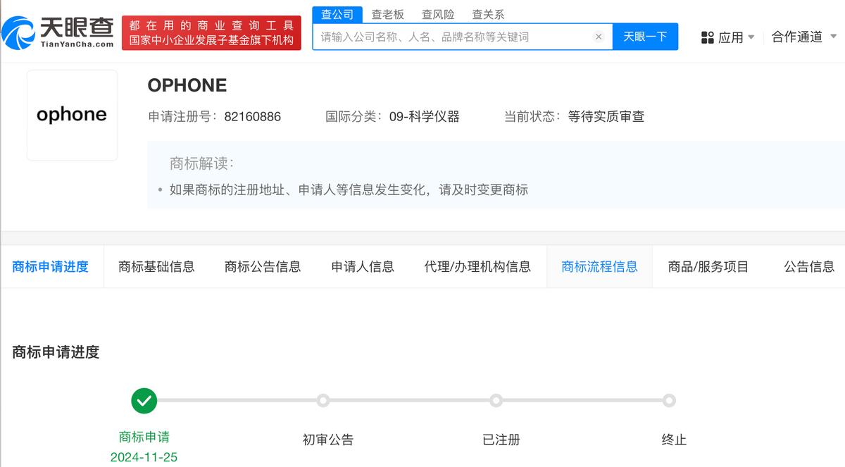 天眼查APP商标信息显示,去年11月,OPPO申请了一个OPHONE的商标,目前仍然在申请阶段还未过初审。
