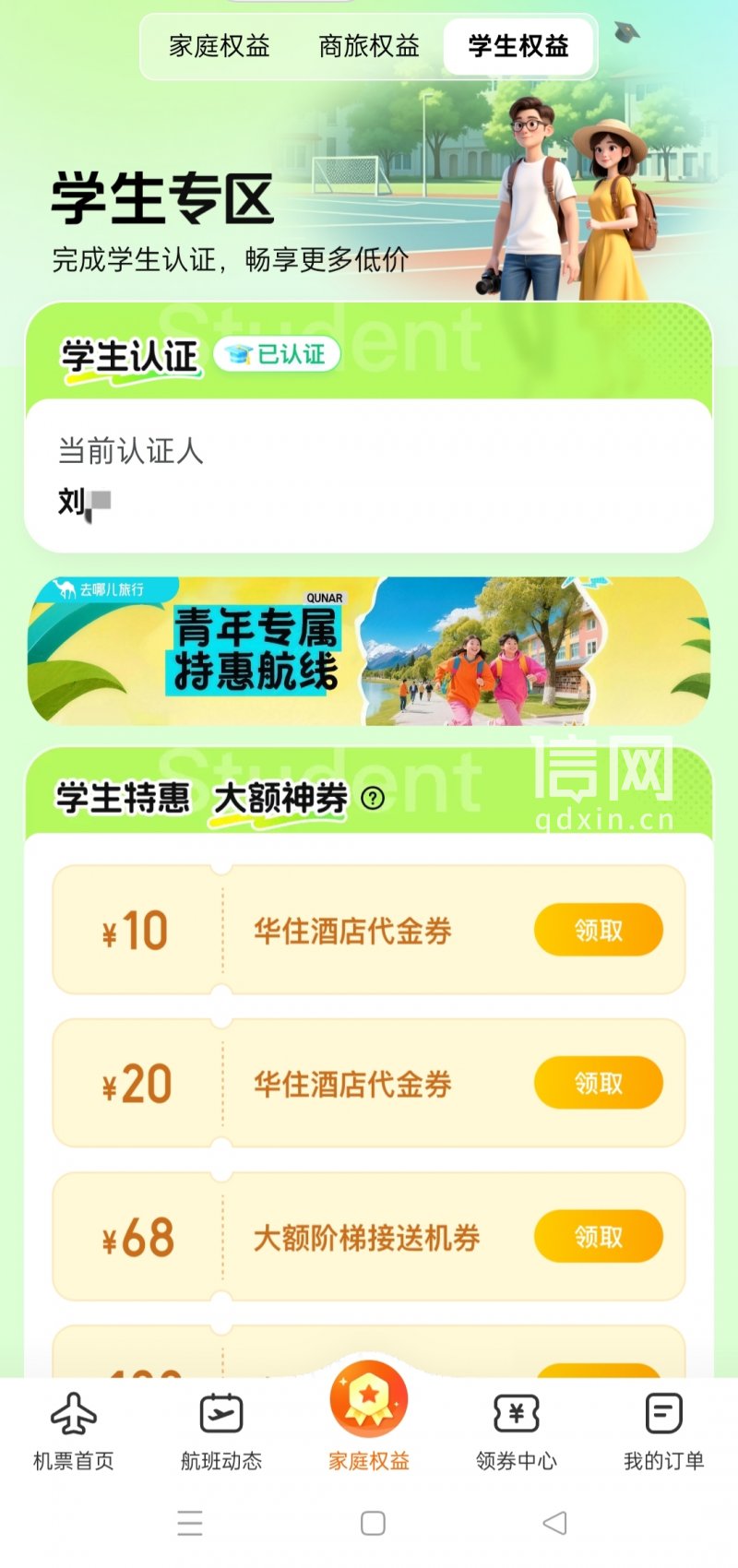 刘同学在携程及去哪儿网平台学生认证截图。(来源:受访者)
