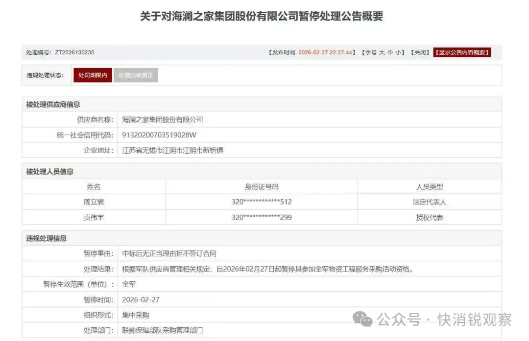 事情是这样的。2026年2月27日,军队采购网轻飘飘地挂出一则公告,内容却炸翻了天:国民男装海澜之家,因为“中标后无正当理由拒不签订合同”,被暂停参加全军采购活动资格。注意,是“全军”!上到空军飞行服,下到陆军作训鞋,只要是部队的单子,通通say goodbye。