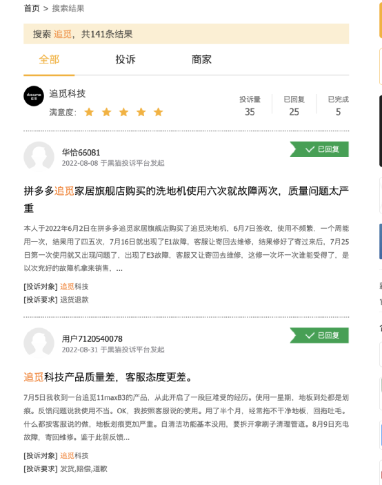 不仅如此,在黑猫投诉上,关于追觅的投诉也有一百多件,除了质量问题之外,还有售后服务也差强人意。