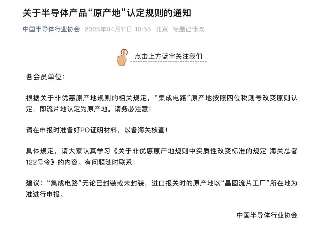 关税反制措施刚刚落靴,国内半导体行业果断跟进。同日,中国半导体行业协会发布关于半导体产品“原产地”认定规则的紧急通知。通知指出,根据海关总署的相关规定,“集成电路”原产地按照四位税则号改变原则认定,即流片地认定为原产地。