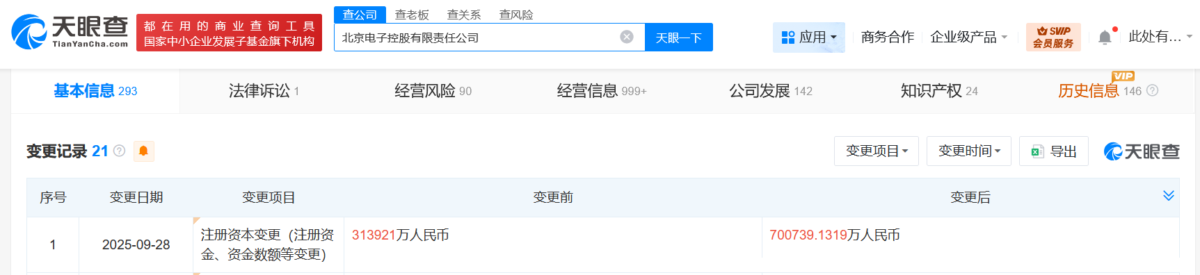 天眼查App显示,近日,北京电子控股有限责任公司发生工商变更,注册资本由约31.39亿人民币增至约70.07亿人民币,增幅约123%,同时,李岩、赵健辉卸任监事职务。