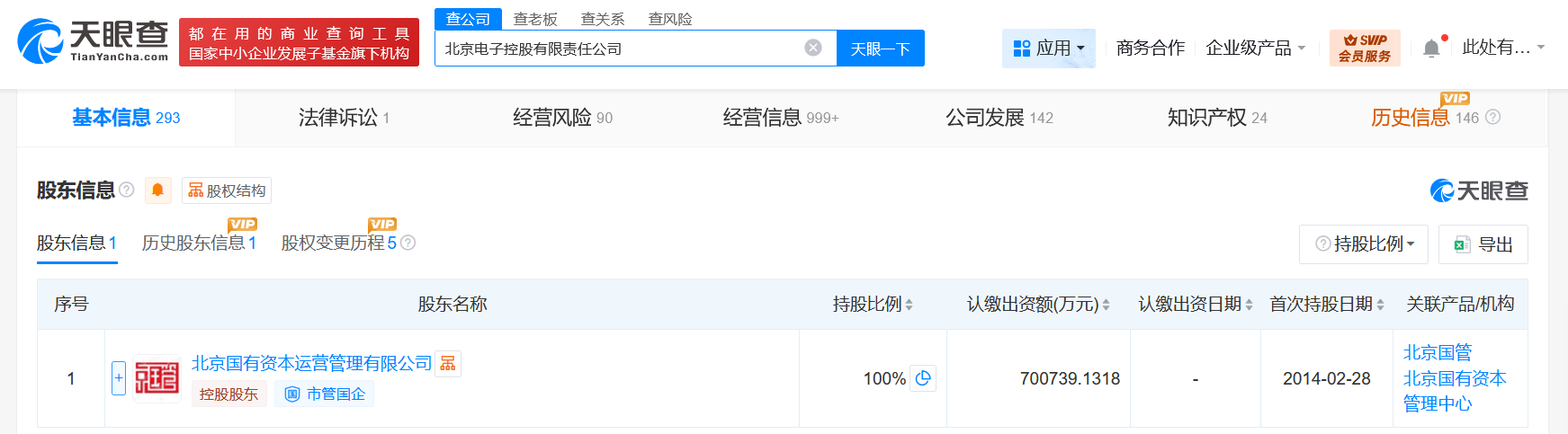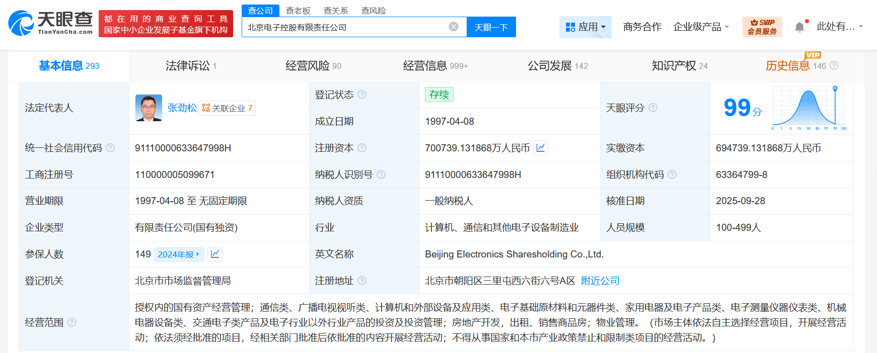 该公司成立于1997年4月,法定代表人为张劲松,经营范围含授权内的国有资产经营管理,通信类、广播电视视听类、计算机和外部设备及应用类、电子基础原材料和元器件类等以外行业产品的投资及投资管理等。股东信息显示,该公司由北京国有资本运营管理有限公司全资持股。
