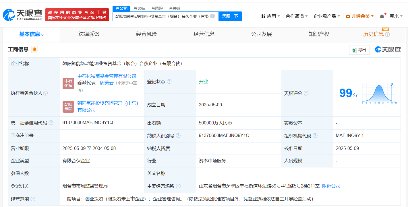 天眼查App显示,近日,朝阳氢能新动能创业投资基金(烟台)合伙企业(有限合伙)成立,执行事务合伙人为中石化私募基金管理有限公司、朝阳氢能投资咨询管理(山东)有限公司,出资额50亿人民币,经营范围为创业投资、企业管理咨询,由中国石化集团资本有限公司、烟台国泰诚丰资产管理有限公司、山东省新动能绿色先行投资中心(有限合伙)等共同出资。