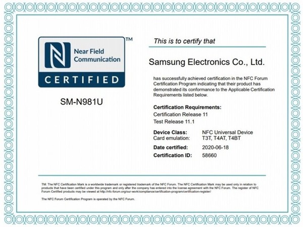 发布指日可待!三星Galaxy Note20系列已通过NFC Forum认证快报