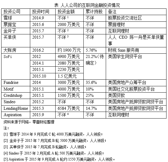 在自身业务方面,2014年10月,人人公司推出了大学生分期购物平台"人人分期"。2014年底,分期乐和趣分期已经分别获得1亿美元融资。2015年初,人人公司推出网贷理财平台"人人理财"。2015年1月,趣分期即先行推出了理财平台"金蛋理财"。