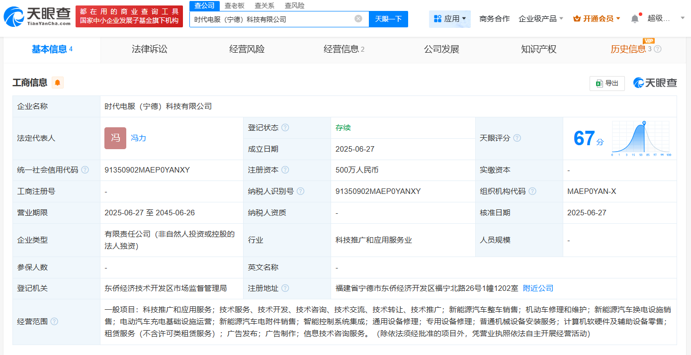 天眼查App显示,近日,时代电服(宁德)科技有限公司成立,法定代表人为冯力,注册资本500万人民币,经营范围包括新能源汽车整车销售、电动汽车充电基础设施运营、新能源汽车电附件销售等。