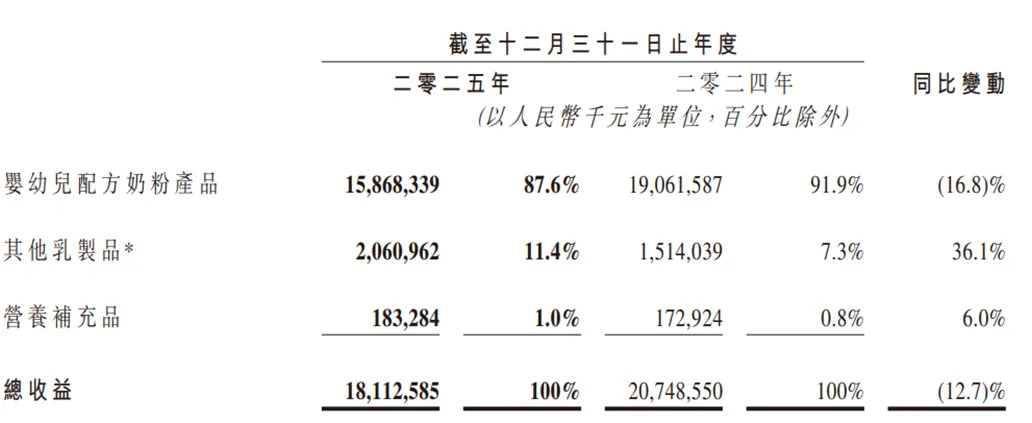 从业务结构来看,作为核心支柱的婴幼儿配方奶粉业务,成为营收下滑的主要拖累。公司财报显示,2025年飞鹤婴幼儿配方奶粉产品实现收益158.68亿元,占总收益的87.6%,但同比下滑16.8%,这是该业务占比近年来首次跌破九成,标志着飞鹤长期依赖的单一增长引擎开始熄火。