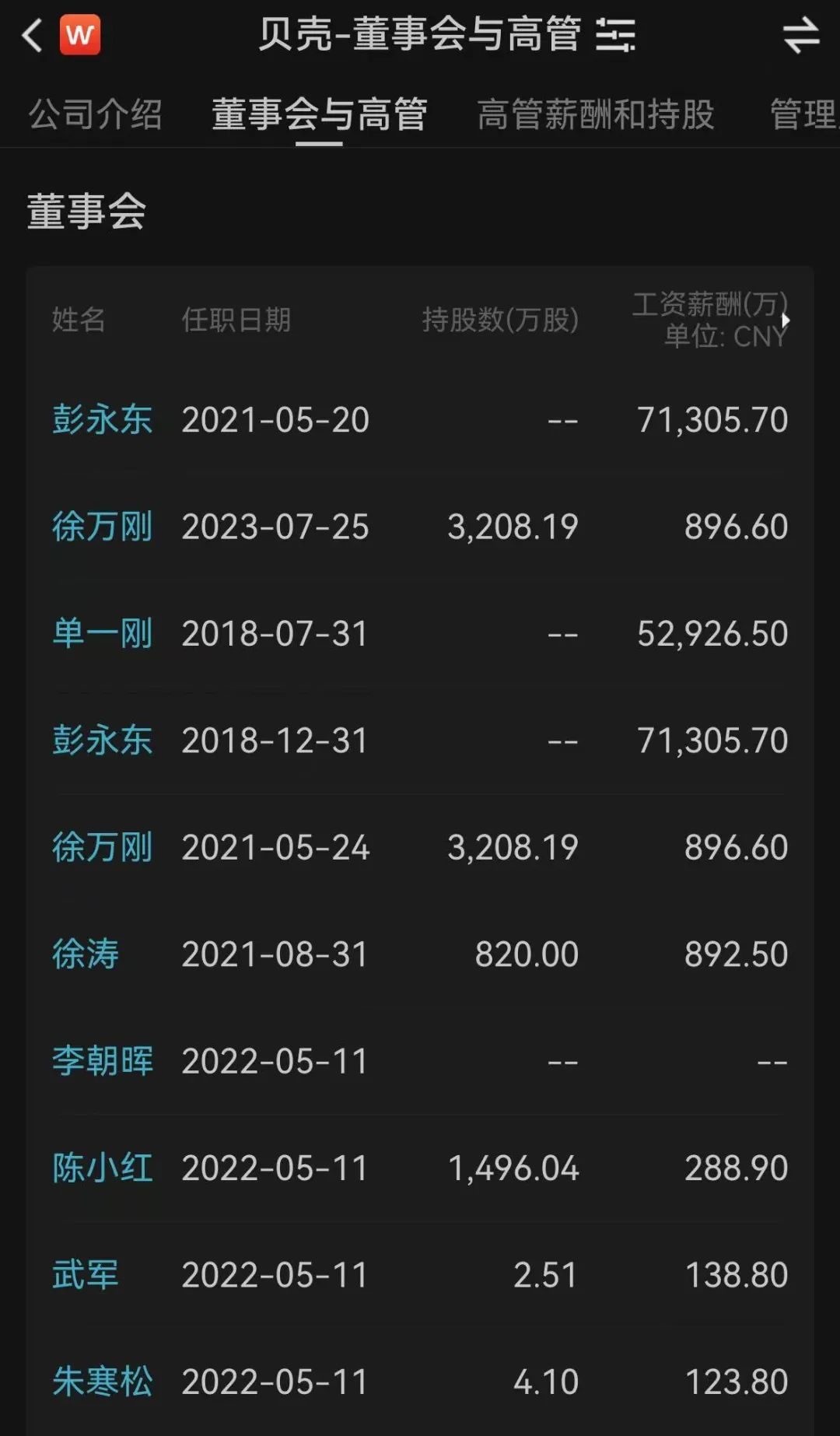 贝壳年报数据显示,2023年,公司董事长彭永东的薪酬为7.13亿元,公司执行董事单一刚的薪酬为5.3亿元。彭永东和单一刚都是贝壳的联合创始人,按照贝壳的薪酬政策,二人均通过此前股份激励计划在归属期获得了对应的股份支付薪酬。