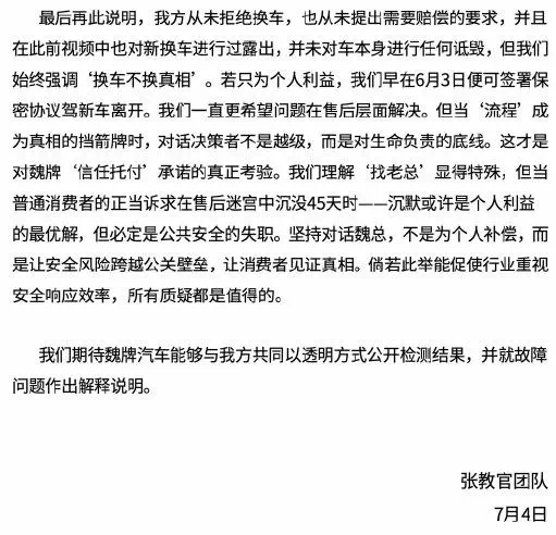 截至7月5日,故障车仍封存待检。这场纠纷已超越个体争议,直击行业深层矛盾。很难想象,一个700万粉丝的网红求真都这么难了,那普通消费者在4S店迷宫中如何才能保障话语权?而且,魏建军曾表示“质量是企业的生命线”,但面对公共安全质疑,是不是应该也要出来说清楚?正如张教官所说的:“我只想要一个真相,过分吗?”