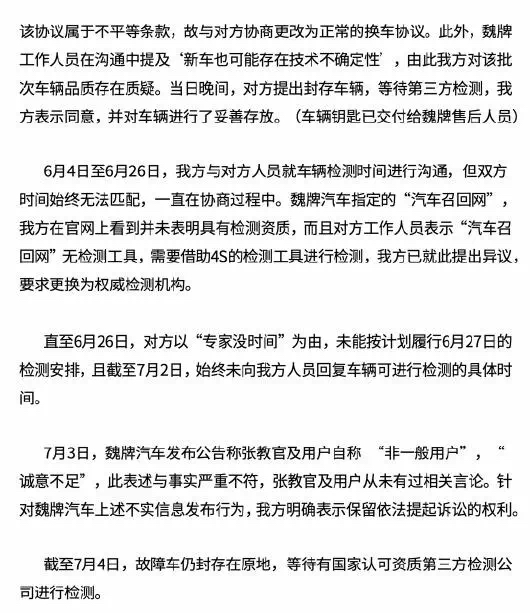 中途经过双方多轮沟通,依然无果,目前双方各自发出声明,但说法各持己见,导致目前这个事件仍是困局。根据双方公告的描述,其实从中大概可以了解到事件的前因后果,一开始是双方对诉求偏差问题导致引发危机,张教官这方最初的核心诉求很简单,就是要真相。而魏牌这方则从代步车、换车等保障出发。