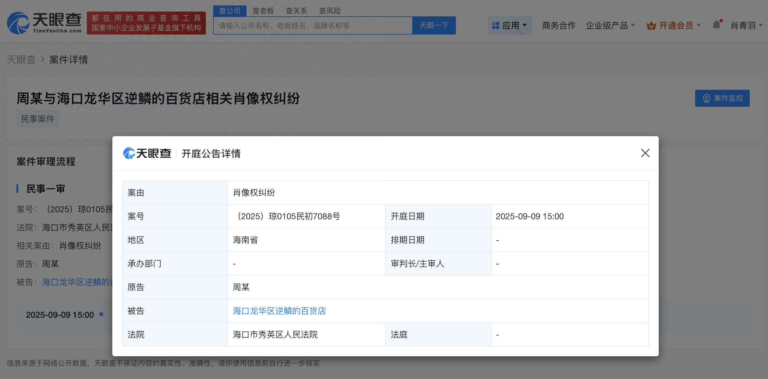 天眼查法律诉讼信息显示,近日,周杰伦与海口龙华区逆鳞的百货店相关肖像权纠纷案件新增开庭公告,原告为周杰伦,该案件将于9月9日开庭审理。