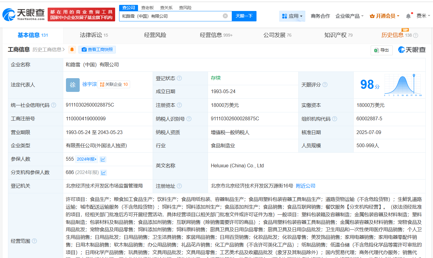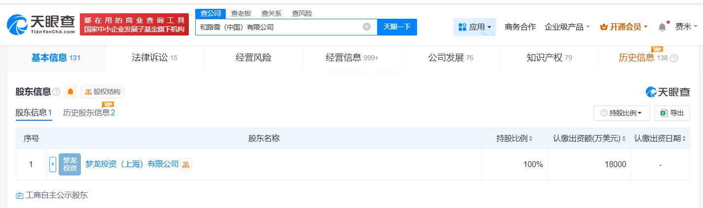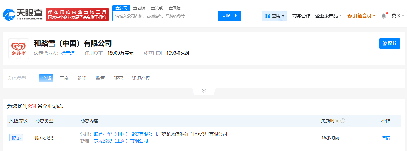 天眼查App显示,近日,和路雪(中国)有限公司发生工商变更,原股东联合利华(中国)投资有限公司、梦龙冰淇淋荷兰控股3号有限公司退出,新增梦龙投资(上海)有限公司全资持股。