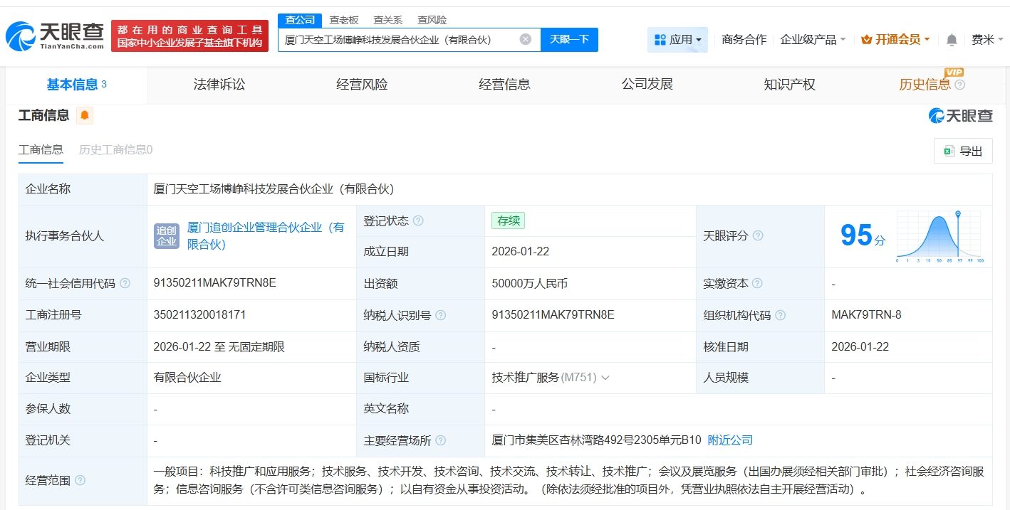天眼查工商信息显示,近日,厦门天空工场博铭科技发展合伙企业(有限合伙)、厦门天空工场博楠科技发展合伙企业(有限合伙)、厦门天空工场博峥科技发展合伙企业(有限合伙)成立,执行事务合伙人均为厦门追创企业管理合伙企业(有限合伙),出资额均为5亿人民币,经营范围包括技术服务、技术开发、技术咨询、技术交流、技术转让、技术推广等。