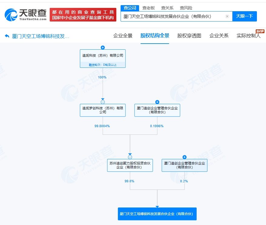 天眼查工商信息显示,近日,厦门天空工场博铭科技发展合伙企业(有限合伙)、厦门天空工场博楠科技发展合伙企业(有限合伙)、厦门天空工场博峥科技发展合伙企业(有限合伙)成立,执行事务合伙人均为厦门追创企业管理合伙企业(有限合伙),出资额均为5亿人民币,经营范围包括技术服务、技术开发、技术咨询、技术交流、技术转让、技术推广等。股权全景穿透图显示,上述三家合伙企业均由追觅科技旗下苏州追创聚力股权投资合伙企业(有限合伙)、厦门追创企业管理合伙企业(有限合伙)共同出资。