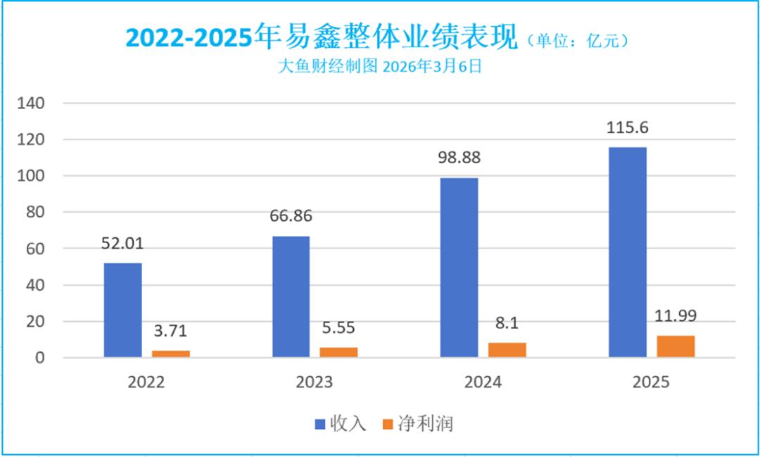 最新业绩公告显示,2025年易鑫实现总收入115.6亿元,突破百亿元,同比增长16.91%;净利润11.99亿元,同比大涨48.02%。