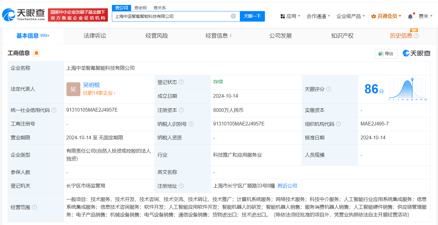 天眼查App显示,近日,上海中坚智氪智能科技有限公司成立,法定代表人为吴明根,注册资本8000万人民币,经营范围含计算机系统服务、网络技术服务、科技中介服务、人工智能行业应用系统集成服务、信息系统集成服务、智能机器人的研发等,由中坚科技(002779)全资持股。