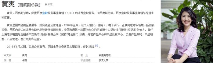 据自媒体“新流财经”报道,百度副总裁黄爽(前陆金所执委)加盟中信产业基金,并成为合伙人统管消费金融事务。由此推测,“晓花科技”董事长黄爽与百度前副总裁很可能为同一人。
