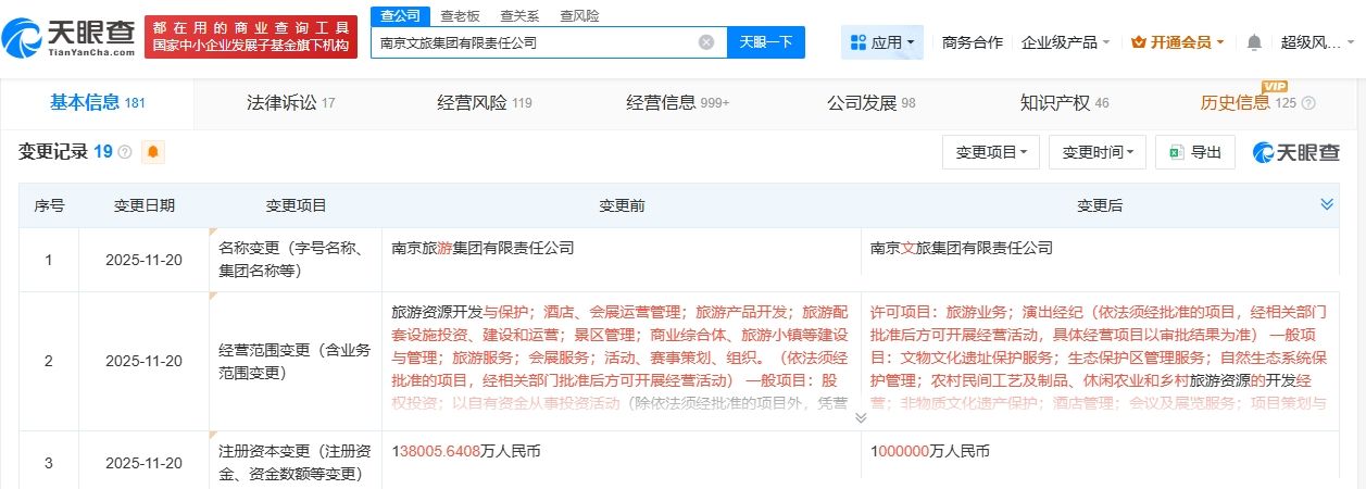 天眼查App显示,近日,南京旅游集团有限责任公司发生工商变更,企业名称变更为南京文旅集团有限责任公司,注册资本由约13.8亿人民币增至100亿人民币,同时经营范围也发生变更。