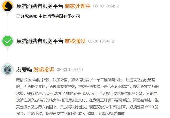 2024年8月30日,有位消费者投诉称,信贷员打电话给他说是可以贷款,添加微信后给他发了一个二维码填写资料,提交后该信贷员以验证是否有还款能力为由要求银行账户必须有20%的钱也就是4000元,结果钱转进去后就被划走。信贷员声称走完流水后,会分两次转回来,又以银行不过审为由让客户再转入6000元才下款。