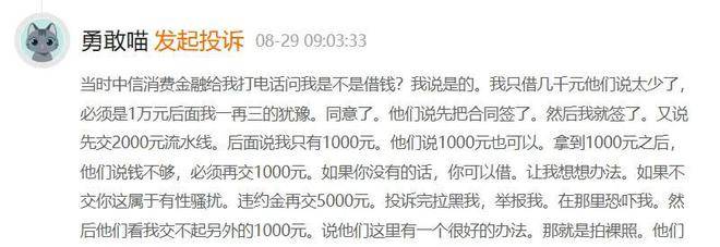 另有消费者表示,其接到自称“中信消费金融”的电话,问其是否需要贷款,在得到肯定的回答后,信贷员声称需要2000元的流水线,但该消费者只有1000元,在收了1000元后,信贷员又以性骚扰恐吓威胁再交5000元,并诱导其拍“裸照”抵款。