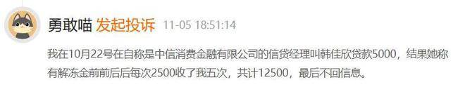 还有消费者表示,其在2024年10月22日,一位自称是中信消费金融有限公司的信贷经理韩佳欣向其提供贷款5000元,结果该信贷员以需要解冻金为由,每次收取2500元,五次收了共计12500,最后不回信息。