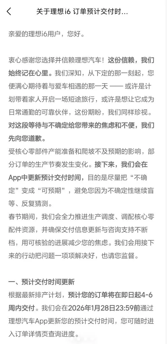 1月28日晚,当他习惯性地刷新理想汽车App时,原本倒计时仅剩“1-2周”的进度条突然消失,取而代之的是一份冰冷的官方公告和变成了“6-8周”的模糊期许。此时,距离他2025年10月19日下定锁单,已经过去了整整103天。