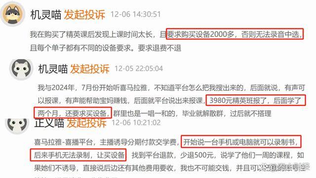 实际上,吴女士的遭遇并非个例。在黑猫投诉平台上,有大量消费者反映了自己在喜马拉雅平台上的类似经历。他们都是在报名付费课程后,被“班主任”以各种方式告知需要继续购买设备或课程,否则无法录制音频、接单赚钱。这种“套娃式营销”手段让消费者感到愤怒和失望。