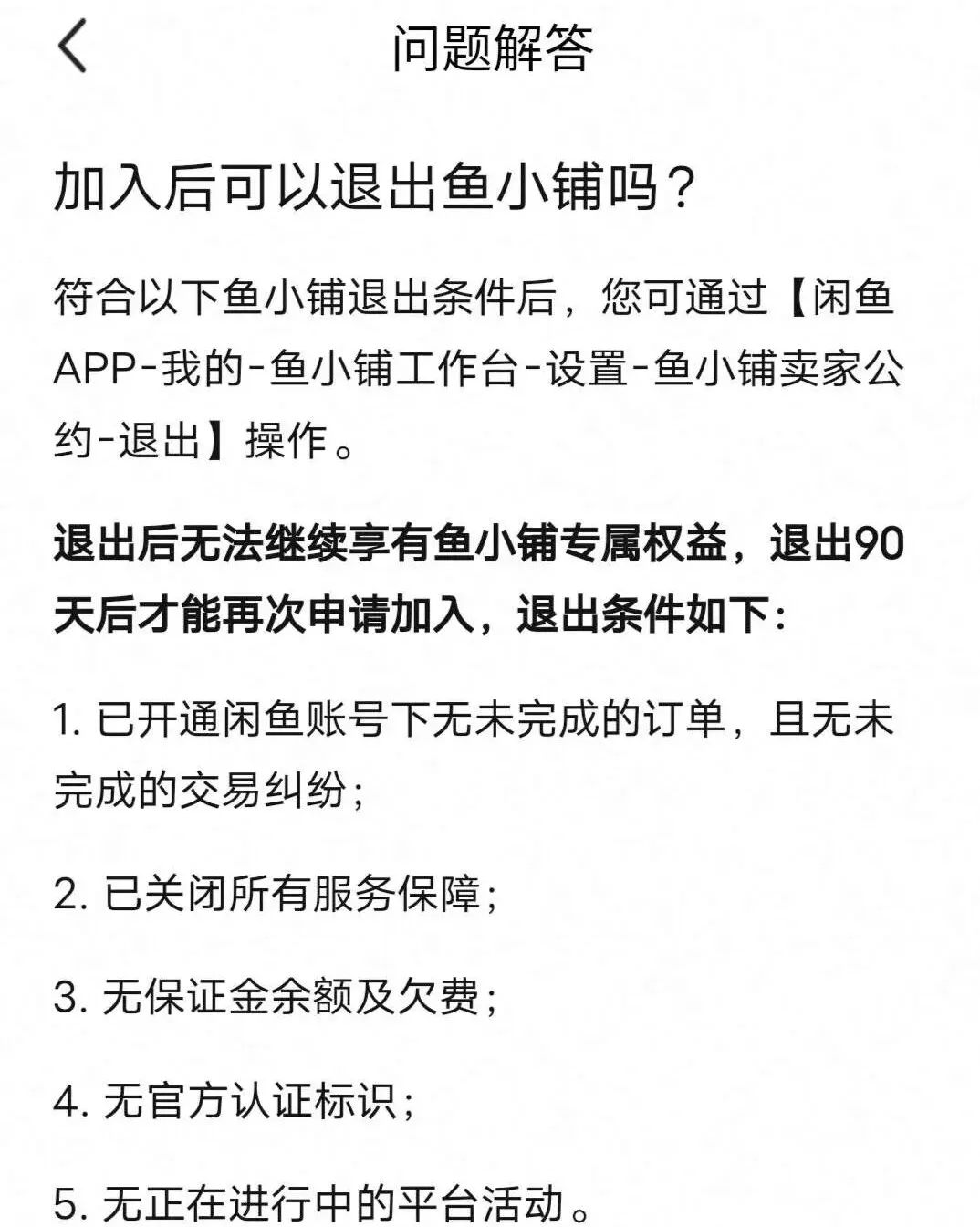 电厂注意到,闲鱼用户可以主动申请退出鱼小铺权限,前提是没有未完成订单和交易纠纷、已关闭所有服务保障、无保证金余额及欠费、无官方认证标识、无正在进行中的平台活动,而且退出90天后才能再次申请加入。前述卖家已经打算退掉鱼小铺,“那些工具都得花钱,要是不想花钱的话,用这个也就是能上架更多商品,外加看一眼经营数据,其他的没什么帮助”。
