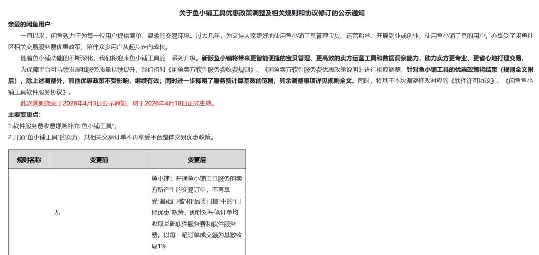 他们的猜想变成了现实。2026年4月3日,闲鱼宣布变更软件服务费收费规则,自4月18日起,除了此前0.6%的基础软件服务费,还将对鱼小铺卖家收取1%的软件服务费,即后者的整体费率从0.6%上调至1.6%。