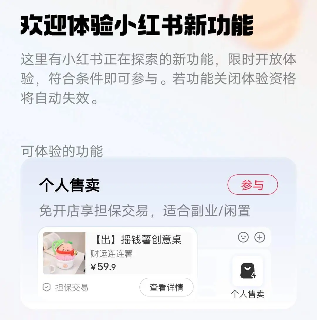 当然,也不是没有新的选择。小红书正在探索“个人售卖”功能,账号注册时间大于30天、实名升级为个人专业号,即可参与体验,不需要缴纳保证金,适合闲置出售或作为副业。不过,该功能依然处于限时开放体验阶段,规模较小,尚未开设独立入口。
